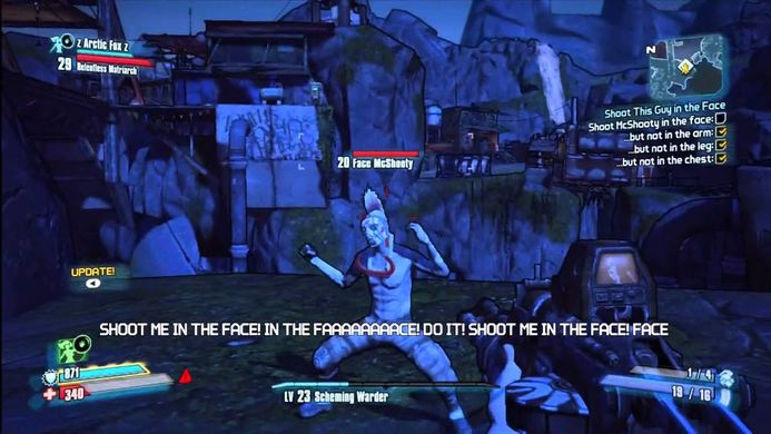 I distinctly remember one of the quests in Borderlands 2, where you suddenly encounter a loud individual named Face McShooty. Immediately, you are given a new quest: Shoot Face McShooty in the face. He asks for this relatively politely over and over until you oblige, and when you do, he doesn’t forget to yell “THANK YOU”. I’ll never understand why he wanted this so badly, but I do remember this moment when I try to recount this gaming experience to others.