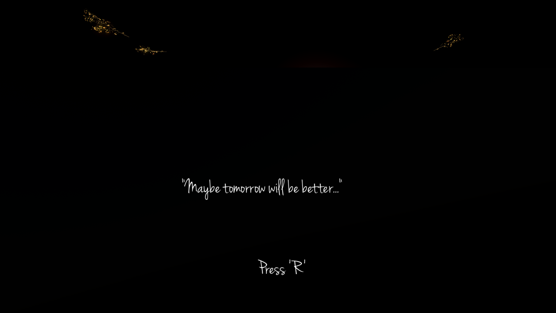 This game is meant to evoke the anxiety of running from home, the fear that your past might catch up to you, and the freedom that comes with making it out of a bad situation. I needed to make this house menacing, uncanny and unnerving. The last thing people expect a house to do is move, let alone chase you, so I set up the beginning of the game to be tame. Players start in front of the house; they can examine it, but they can’t enter, the door rejecting their advances. As they lose interest and walk away, the unnerving music and sounds also die down, but at a certain point, they hear the sounds of wood violent snapping and groaning behind them. If they look back, they can see the house lumbering towards them, the music and clicking sounds increasing in intensity the closer you were to the house. If they don’t run hard enough, or if they fall off the road into oblivion, they fail to escape and start over again. “Maybe tomorrow will be better…”