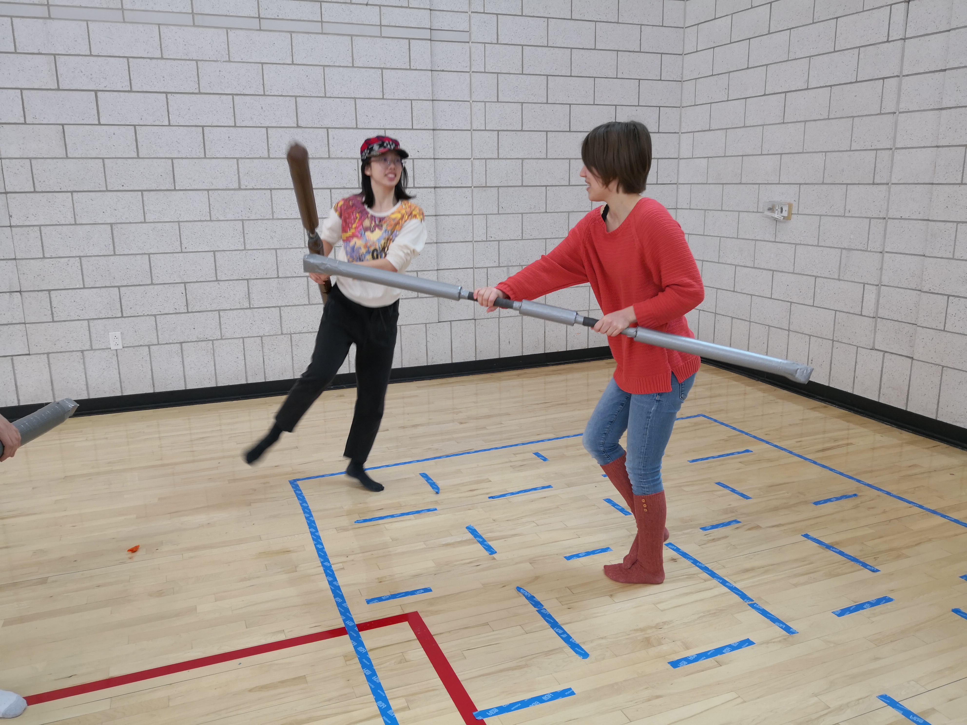 Playtest #2: Without rules, aside from an assumed arena, one foot hopping, and respectful boffer play, the intended experience was achieved. Players had fun dancing around and pretend spar, twirling, losing balance, engage in interesting fake combat.