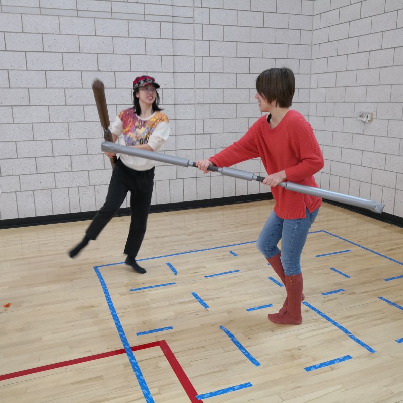 Rules and Set Up #1: All players have 1 two-handed foam staff (stab and smack legal) and one brightly colored spell packet. Make a 4×4 grid using chalk/tape on the floor, creating an arena that accommodates a decent amount of shuffling.