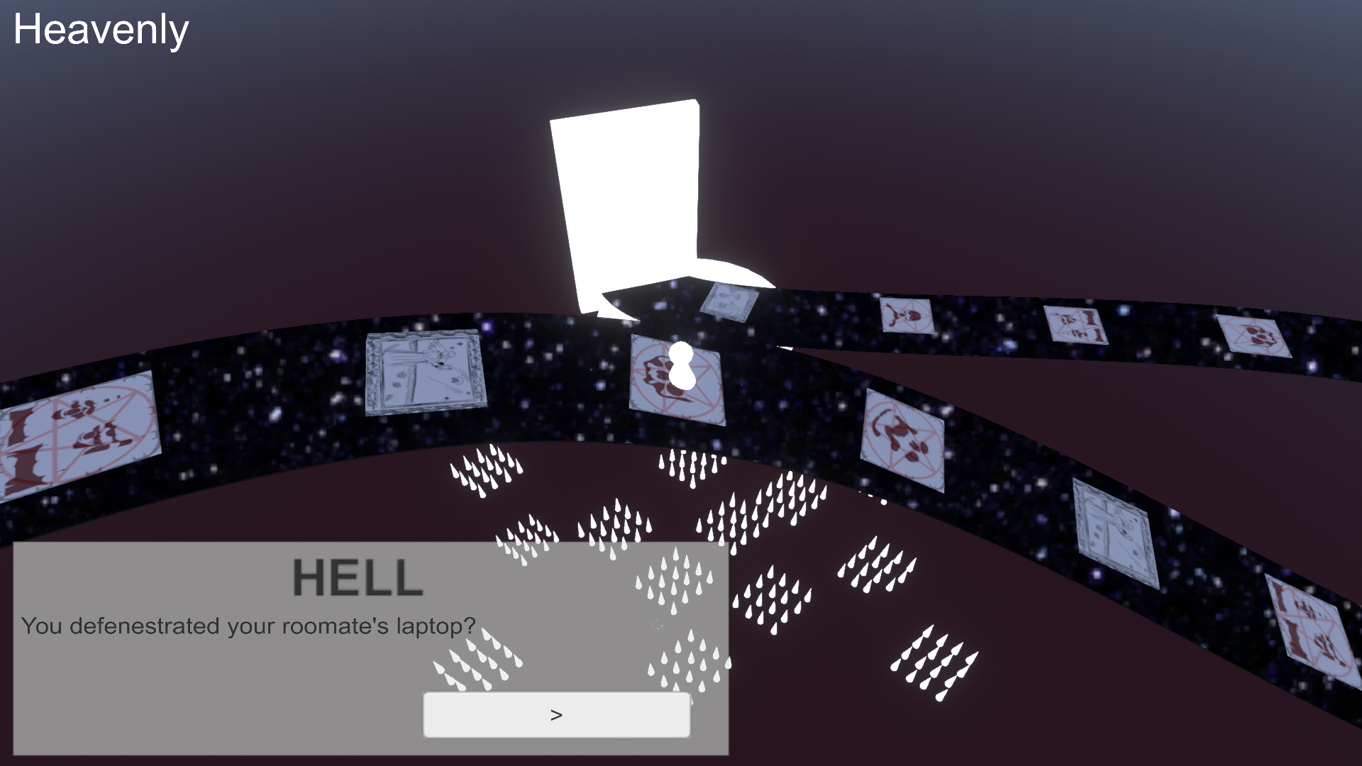 There is a board game that’s being played that you directly influence with your rolls. Each tile has a moment from your life that was either heavenly or hellish (no matter how mediocre or insignificant) and it’s up to you to land on the right spots to show God your good or bad side.